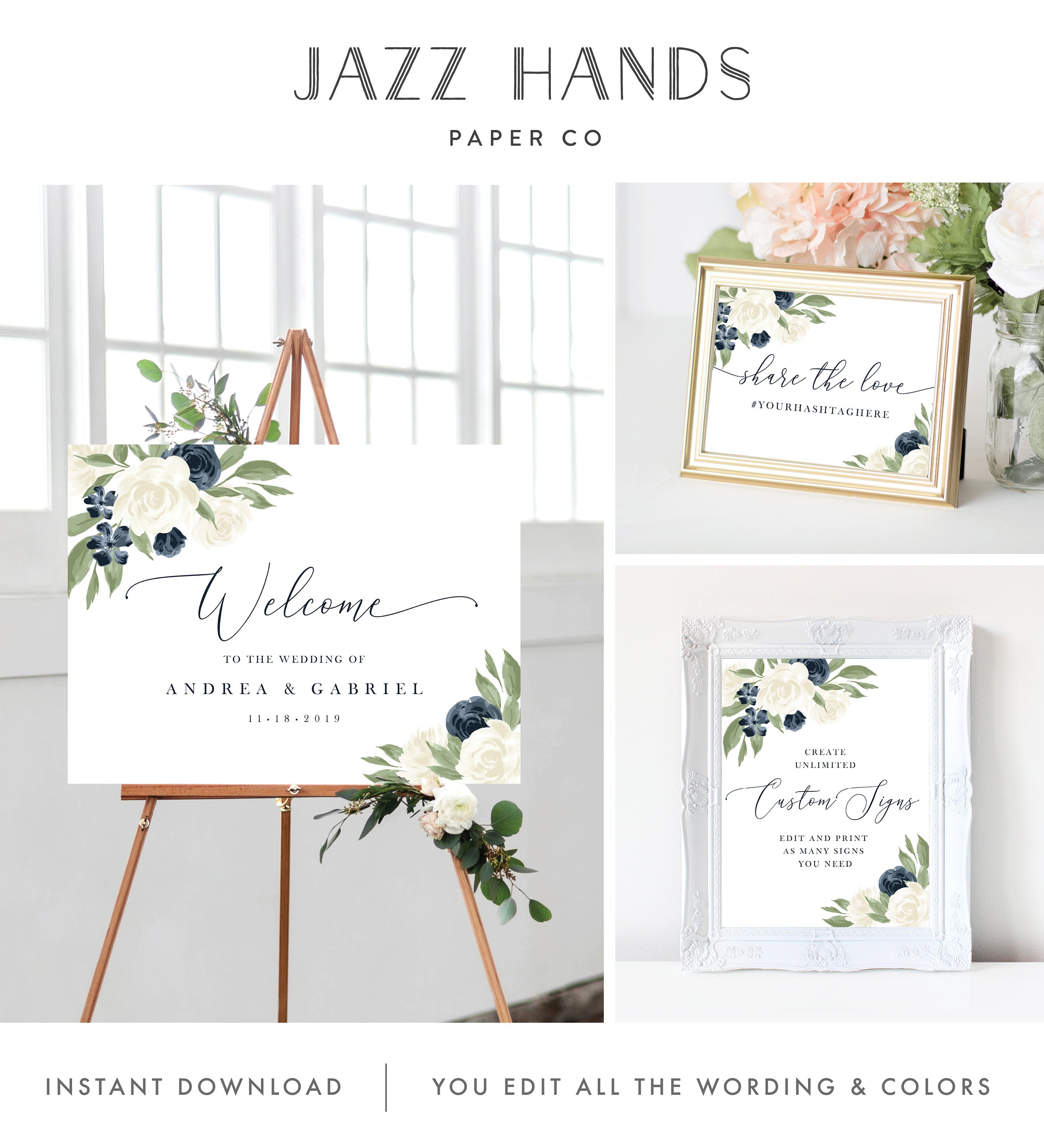 Welcome To Our Wedding Sign Wedding Sign Bundle Wedding Hashtag Sign Wedding Signs Navy And White Floral Signs Edit With Templett